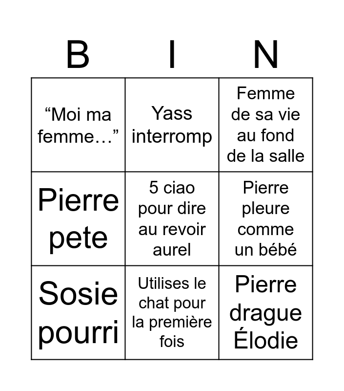 This bingo card has a free space and 8 words: Pierre pete, Yass interromp, Pierre pleure comme un bébé, Sosie pourri, Femme de sa vie au fond de la salle, “Moi ma femme…”, Utilises le chat pour la première fois and Pierre drague Élodie.