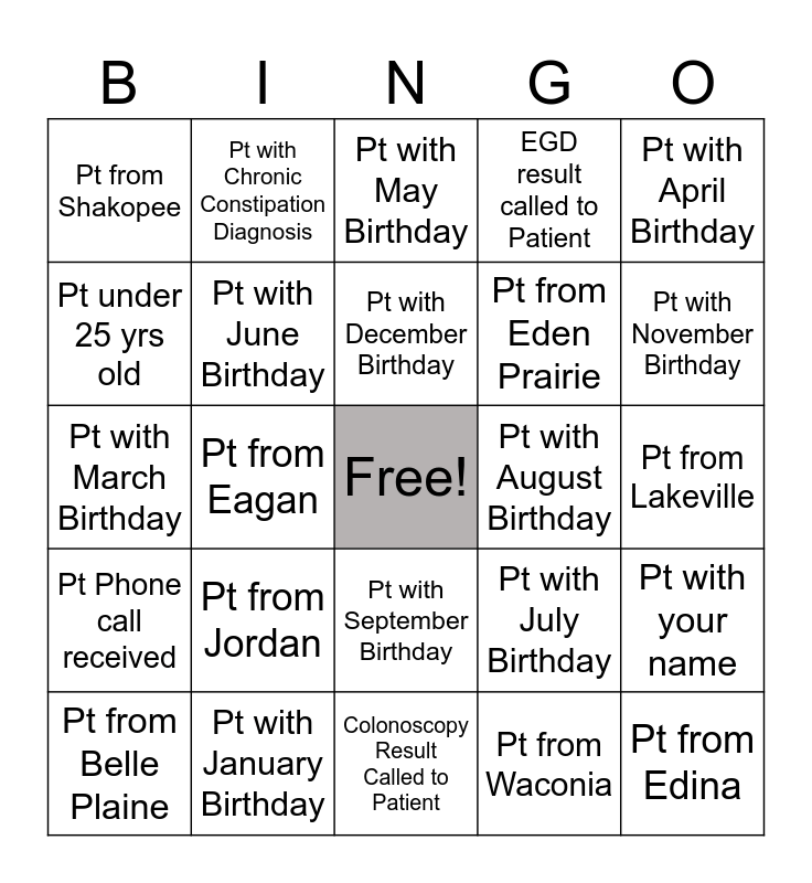 This bingo card has a free space and 34 words: Pt from Prior Lake, Pt from Waconia, Pt with February Birthday, Pt from Chaska, Pt Phone call received, Pt with June Birthday, Pt with April Birthday, Pt from Belle Plaine, Pt with Chronic Constipation Diagnosis, Pt who is a current Smoker, Pt with December Birthday, Pt with May Birthday, Pt from Burnsville, Pt from Savage, Pt with August Birthday, Pt with November Birthday, Pt with January Birthday, Pt with March Birthday, Pt from Jordan, Pt with July Birthday, Pt with September Birthday, Pt with October Birthday, Pt from Shakopee, Pt from Lakeville, Colonoscopy Result Called to Patient, Pt from Edina, EGD result called to Patient, Pt phone call made, Pt from Eden Prairie, Pt under 25 yrs old, Pt over 80 yrs old, Pt from Eagan, Pt with your name and Pt here with Spouse.
