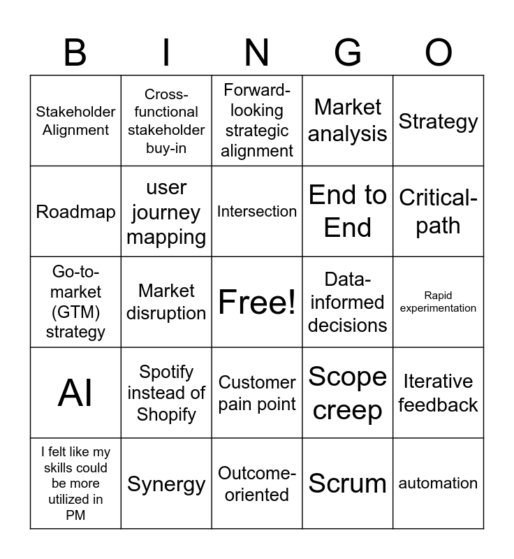 This bingo card has a free space and 24 words: Spotify instead of Shopify, Synergy, Intersection, I felt like my skills could be more utilized in PM, Strategy, Stakeholder Alignment, Roadmap, Cross-functional stakeholder buy-in, Data-informed decisions, Customer pain point, End to End, Go-to-market (GTM) strategy, Scope creep, Iterative feedback, user journey mapping, Scrum, Rapid experimentation, Forward-looking strategic alignment, Critical-path, Market disruption, automation, AI, Market analysis and Outcome-oriented.