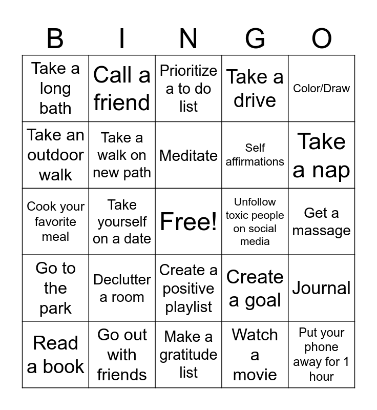 This bingo card has a free space and 24 words: Declutter a room, Go out with friends, Meditate, Read a book, Color/Draw, Take a long bath, Take an outdoor walk, Call a friend, Unfollow toxic people on social media, Create a positive playlist, Self affirmations, Cook your favorite meal, Create a goal, Journal, Take a walk on new path, Watch a movie, Get a massage, Prioritize a to do list, Take a nap, Take yourself on a date, Put your phone away for 1 hour, Go to the park, Take a drive and Make a gratitude list.