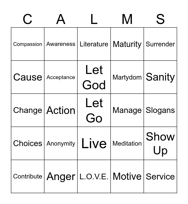 This bingo card has 45 words: Cure, Acceptance, Listen, Motive, Serenity, Control, Awareness, Learn, Martydom, Service, Cause, Action, Let Go, Manage, Steps, Care, Amends, Let God, Mothering, Slogans, Compassion, AFG, Live, Maturity, Self care, Contribute, Anger, Let Live, Meditation, Show Up, Courage, Anonymity, L.O.V.E., Mind Your Own Business, Spiritual Awareness, Choices, Advice, Lonely, Sponsor, Change, Literature, Sanity, Committment, Surrender and Communication.