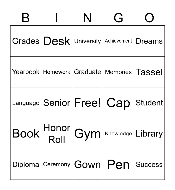 This bingo card has a free space and 24 words: Honor Roll, Ceremony, Graduate, Diploma, Dreams, Grades, Yearbook, Desk, Cap, Gym, Memories, Language, Knowledge, Library, Homework, Pen, Student, University, Tassel, Senior, Success, Book, Achievement and Gown.