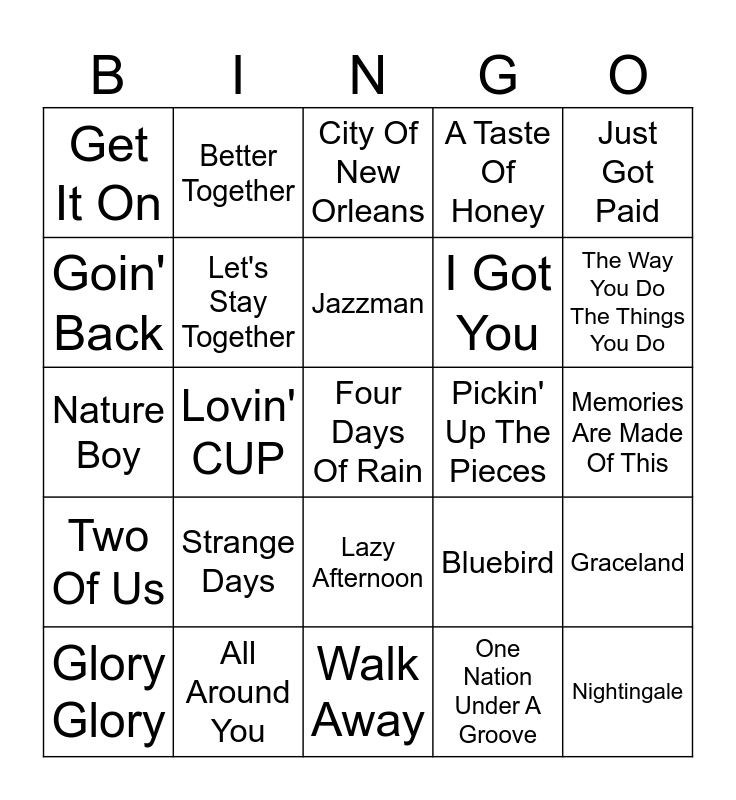 This bingo card has 32 words: One Nation Under A Groove, Rocks Off, Lovin' CUP, Across The Universe, Two Of Us, Let's Stay Together, Just Got Paid, Graceland, Better Together, Nightingale, Jazzman, City Of New Orleans, Still Falling For You, Rag Mama Rag, Pickin' Up The Pieces, Cocoon, Glory Glory, Nature Boy, Lazy Afternoon, Strange Days, Bluebird, Things Get Better, Memories Are Made Of This, All Around You, Four Days Of Rain, A Taste Of Honey, I Got You, Goin' Back, Get It On, Walk Away, First Rose Of Spring and The Way You Do The Things You Do.
