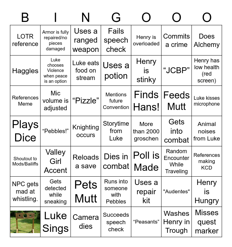 This bingo card has 1 images and 48 words: "Audentes", “JCBP”, “Peasants”, “Pebbles!”, “Pizzle”, Animal noises from Luke, Armor is fully repaired/no pieces damaged, Camera dies, Commits a crime, Dies in combat, Does Alchemy, Fails speech check, Feeds Mutt, Finds Hans!, Gets detected while sneaking, Gets into combat, Haggles, Henry has low health (red screen), Henry is Hungry, Henry is overloaded, Henry is stinky, Knighting occurs, LOTR reference, Luke chooses Violence when peace is an option, Luke eats food on stream, Luke kisses microphone, Luke Sings, Mentions future Convention, Mic volume is adjusted, Misses quest marker, More than 2000 groschen, NPC gets mad at whistling., Pets Mutt, Plays Dice, Poll is Made, Random Encounter While Traveling, References making KCD, References Meme, Reloads a save, Runs into someone with Pebbles, Shoutout to Mods/Bailiffs, Storytime from Luke, Succeeds speech check, Uses a potion, Uses a ranged weapon, Uses a repair kit, Valley Girl Accent and Washes Henry in Trough.