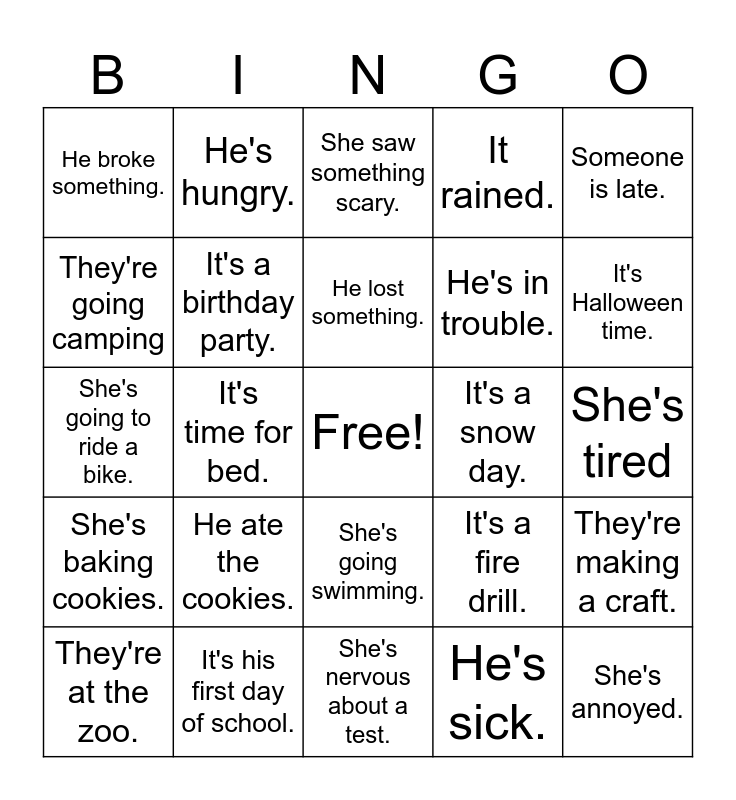 This bingo card has a free space and 24 words: He ate the cookies., It's his first day of school., He lost something., They're at the zoo., Someone is late., He broke something., They're going camping, He's hungry., It's a snow day., She's going swimming., He's in trouble., She's going to ride a bike., It's a fire drill., They're making a craft., It's a birthday party., He's sick., She's tired, She saw something scary., It's Halloween time., It's time for bed., She's annoyed., She's baking cookies., It rained. and She's nervous about a test..