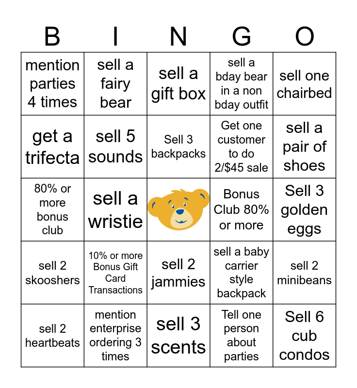 This bingo card has a free space and 24 words: 10% or more Bonus Gift Card Transactions, mention enterprise ordering 3 times, Sell 3 backpacks, sell 2 heartbeats, sell one chairbed, mention parties 4 times, get a trifecta, sell a fairy bear, Bonus Club 80% or more, sell 2 jammies, Get one customer to do 2/$45 sale, 80% or more bonus club, sell a baby carrier style backpack, sell 2 minibeans, sell 5 sounds, Tell one person about parties, Sell 3 golden eggs, sell a gift box, sell a pair of shoes, sell a wristie, Sell 6 cub condos, sell 2 skooshers, sell a bday bear in a non bday outfit and sell 3 scents.