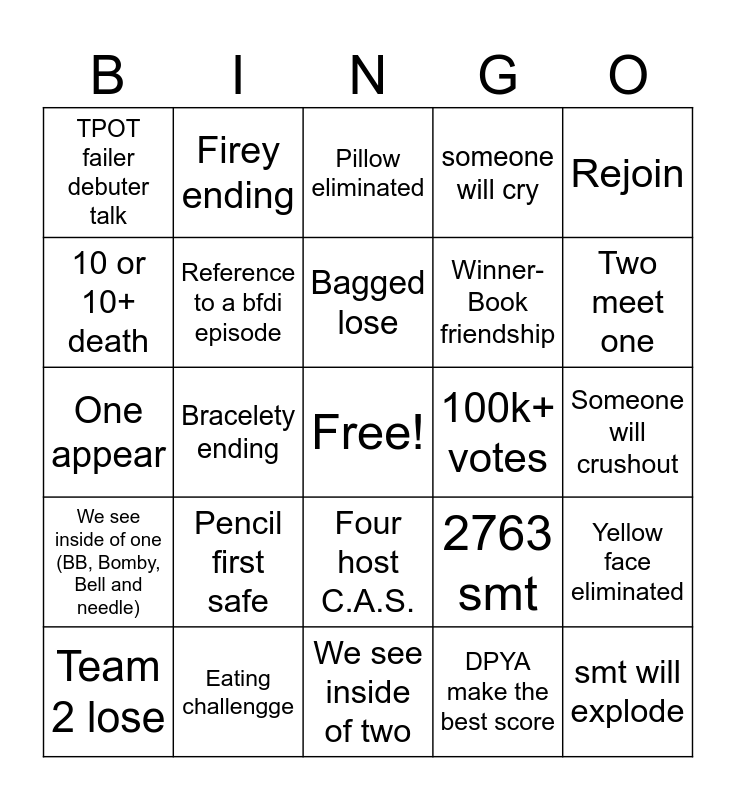 This bingo card has a free space and 24 words: Pencil first safe, Eating challengge, Bagged lose, Team 2 lose, Rejoin, TPOT failer debuter talk, 10 or 10+ death, Firey ending, 100k+ votes, Four host C.A.S., Winner-Book friendship, One appear, 2763 smt, Yellow face eliminated, Reference to a bfdi episode, DPYA make the best score, Someone will crushout, Pillow eliminated, Two meet one, Bracelety ending, smt will explode, We see inside of one (BB, Bomby, Bell and needle), someone will cry and We see inside of two.