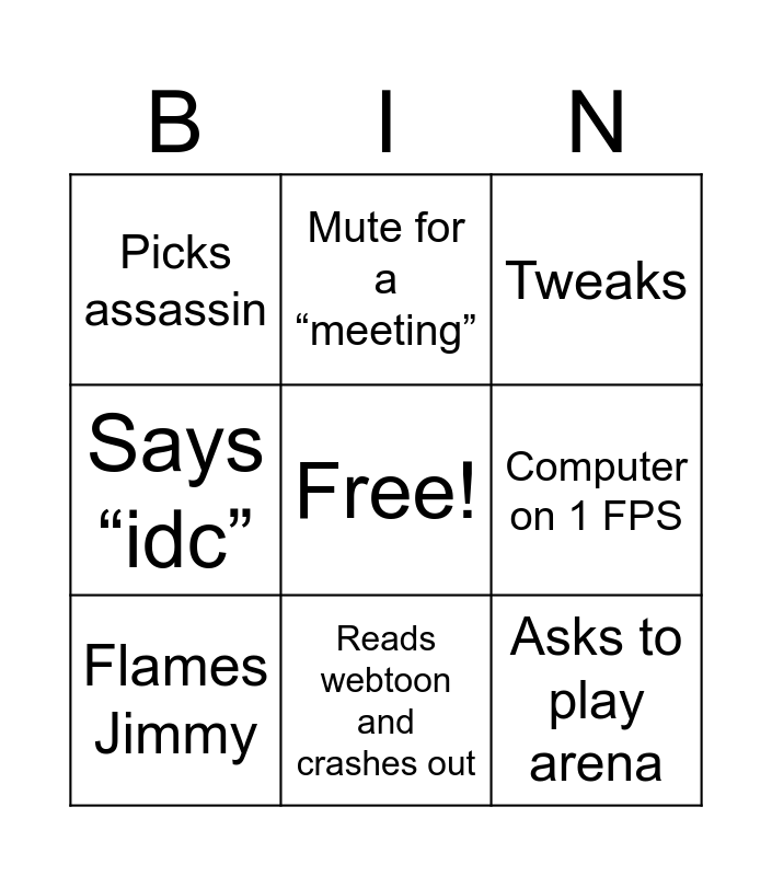 This bingo card has a free space and 8 words: Computer on 1 FPS, Tweaks, Mute for a “meeting”, Flames Jimmy, Picks assassin, Asks to play arena, Says “idc” and Reads webtoon and crashes out.