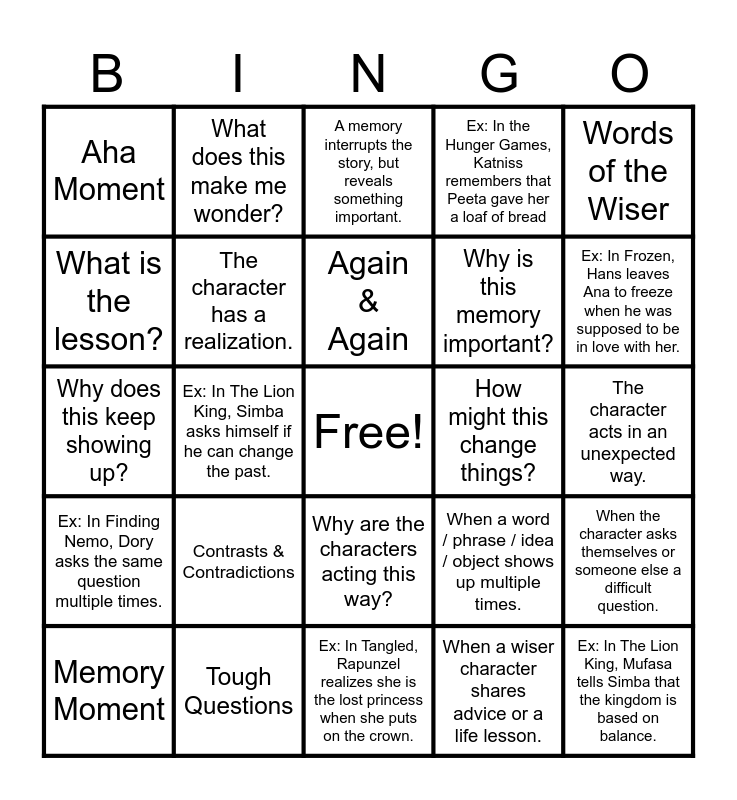 This bingo card has a free space and 24 words: Contrasts & Contradictions, Tough Questions, Again & Again, Memory Moment, Words of the Wiser, Aha Moment, What is the lesson?, What does this make me wonder?, How might this change things?, Why are the characters acting this way?, Why is this memory important?, Why does this keep showing up?, When a word / phrase / idea / object shows up multiple times., When the character asks themselves or someone else a difficult question., The character has a realization., When a wiser character shares advice or a life lesson., The character acts in an unexpected way., A memory interrupts the story, but reveals something important., Ex: In Frozen, Hans leaves Ana to freeze when he was supposed to be in love with her., Ex: In The Lion King, Simba asks himself if he can change the past., Ex: In The Lion King, Mufasa tells Simba that the kingdom is based on balance., Ex: In Finding Nemo, Dory asks the same question multiple times., Ex: In the Hunger Games, Katniss remembers that Peeta gave her a loaf of bread and Ex: In Tangled, Rapunzel realizes she is the lost princess when she puts on the crown..