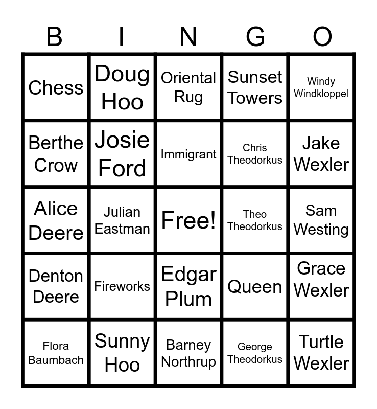 This bingo card has a free space and 34 words: Otis Amber, Jimmy Hoo, Sandy McSouthers, Dr. Sikes, Sam Westing, Berthe Crow, Josie Ford, Barney Northrup, Chris Theodorkus, Turtle Wexler, Alice Deere, Doug Hoo, George Theodorkus, Angela Wexler, Denton Deere, Julian Eastman, Edgar Plum, Theo Theodorkus, Grace Wexler, Flora Baumbach, Sunny Hoo, Sydell Pulaski, Sunset Towers, Jake Wexler, Candle, Fireworks, Oriental Rug, Stock Market, Windy Windkloppel, Chess, Fertilizer, Immigrant, Queen and Toothache.