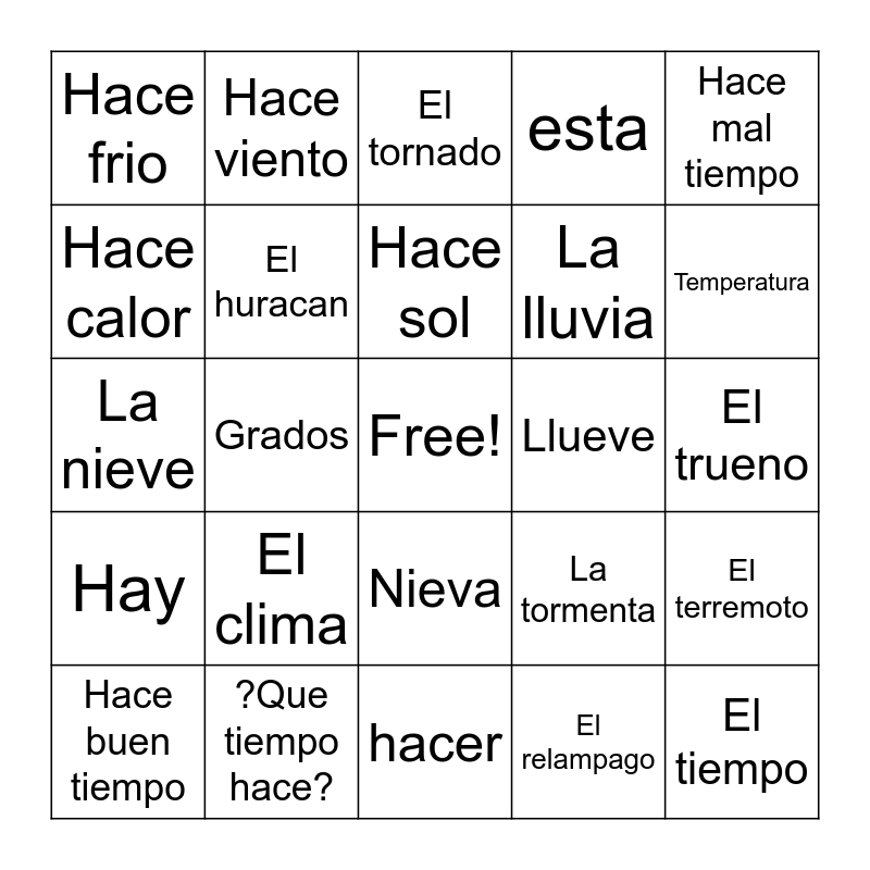This bingo card has a free space and 24 words: El clima, ?Que tiempo hace?, Hace sol, Hace buen tiempo, Hace mal tiempo, Hace frio, Hace calor, Hace viento, Llueve, Nieva, La lluvia, La nieve, La tormenta, El terremoto, El huracan, El relampago, El trueno, El tornado, Temperatura, Grados, El tiempo, Hay, esta and hacer.
