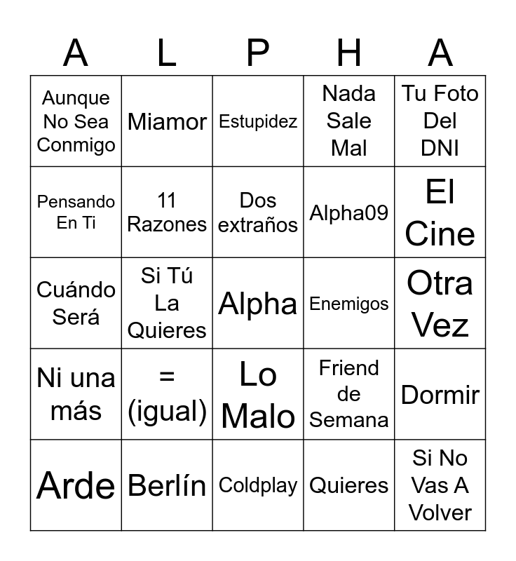 This bingo card has a free space and 78 words: Mon Amour, Las Babys, Miamor, Los Ángeles, Vas A Quedarte, Con La Miel En Los Labios, Mariposas, Corazón Sin Vida, En El Coche, Perdimos La Razón, Arde, Mándame Un Audio, 11 Razones, Tu Foto Del DNI, Me Quedo, Aunque No Sea Conmigo, Friend de Semana, Berlín, Más de Lo Que Aposté, Coldplay, Mejor Qué Tú, Nada Sale Mal, Si Tú La Quieres, Otra Vez, Estupidez, No te has ido y ya te extraño, Presiento, Las Dudas, Formentera, Cuando Te Fuiste, Dormir, La Última, Ni una más, Enemigos, A La Calle, Si No Vas A Volver, Tu Culpa, - (menos), Quieres, = (igual), Quiero, x (POR), (MÁS), Oasis, Teléfono, El Cine, ÷ (dividido), La Canción Que No Quiero Cantarte, Me Levanté, Llueve Sobre Mojado, La Electricidad, Dos extraños, Luna, AQYNE, Ella Bailaba, Dararí, Otra Noche Sin ti, The Killers, 24 Rosas, Pensando En Ti, Alpha09, Las Vegas, Stupid, Hold, Cristal, Popcorn, El Trece, Barro y Hielo, Lo Malo, Cuándo Será, Resilient (Tiësto Remix), Akureyri, Hermosa Casualidad, 4TO 23, I like can, Gran Vía, Segundo Intento and Sentimiento Natural.
