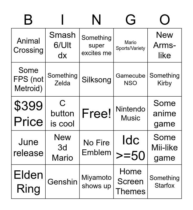 This bingo card has a free space and 24 words: New 3d Mario, Genshin, Silksong, Elden Ring, New Arms-like, Animal Crossing, Some FPS (not Metroid), Smash 6/Ult dx, Nintendo Music, No Fire Emblem, Gamecube NSO, $399 Price, Idc >=50, Some Mii-like game, Something Zelda, Home Screen Themes, Some anime game, Something super excites me, Something Kirby, C button is cool, Something Starfox, June release, Mario Sports/Variety and Miyamoto shows up.