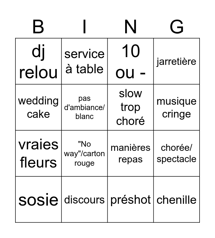 This bingo card has 18 words: "No way"/carton rouge, chenille, 10 ou -, dj relou, manières repas, jarretière, sosie, service à table, musique cringe, vraies fleurs, préshot, wedding cake, chorée/ spectacle, pas d'ambiance/ blanc, slow trop choré, viande cheloue/ manières, discours and feux d'artifices.