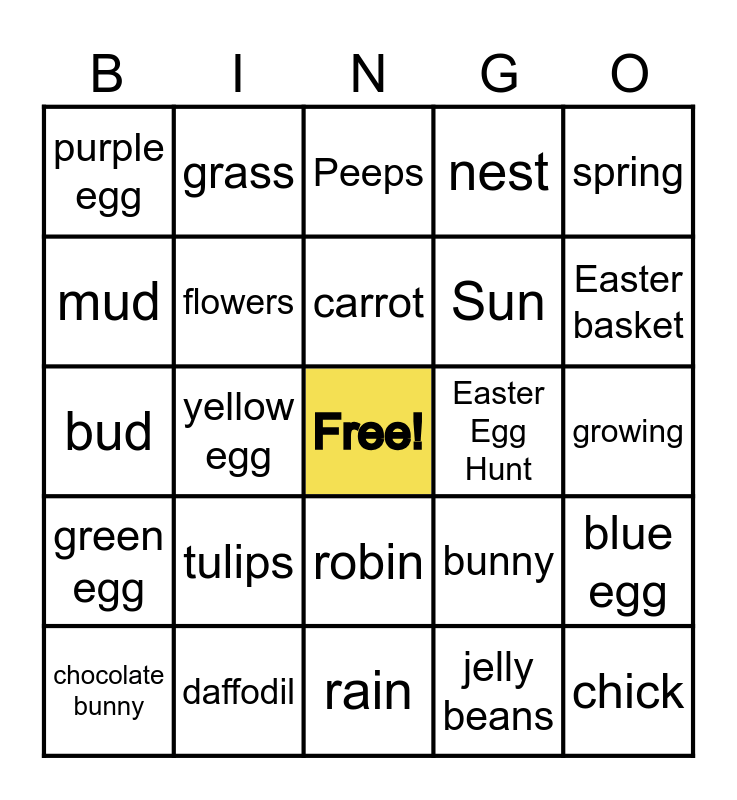This bingo card has a free space and 27 words: bunny, painting eggs, Sun, rain, mud, Peeps, grass, green egg, Easter Egg Hunt, blue egg, bud, nest, chocolate bunny, daffodil, Easter basket, pink egg, flowers, carrot, tulips, purple egg, growing, jelly beans, yellow egg, chick, robin, spring and orange egg.