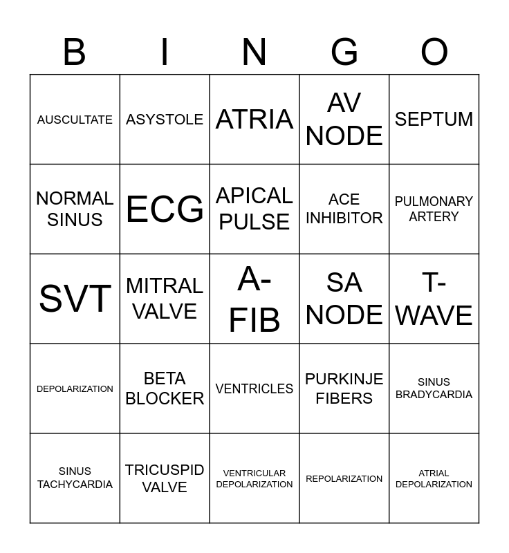 This bingo card has 25 words: BETA BLOCKER, VENTRICULAR DEPOLARIZATION, APICAL PULSE, SINUS TACHYCARDIA, SEPTUM, AUSCULTATE, NORMAL SINUS, ASYSTOLE, SA NODE, VENTRICLES, ACE INHIBITOR, SVT, PURKINJE FIBERS, SINUS BRADYCARDIA, ECG, ATRIAL DEPOLARIZATION, T-WAVE, ATRIA, PULMONARY ARTERY, MITRAL VALVE, A-FIB, TRICUSPID VALVE, DEPOLARIZATION, AV NODE and REPOLARIZATION.