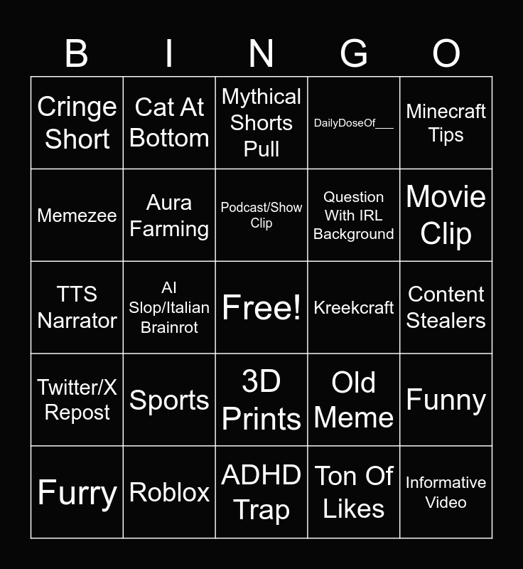 This bingo card has a free space and 29 words: Furry, Steak, AI Slop/Italian Brainrot, Peak Brainrot, Cringe Short, Mythical Shorts Pull, Aura Farming, Sports, Kreekcraft, Roblox, Content Stealers, Informative Video, ADHD Trap, Ton Of Likes, Movie Clip, Minecraft Movie, 3D Prints, Twitter/X Repost, Minecraft Tips, TTS Narrator, Old Meme, Wholesome, Question With IRL Background, Memezee, DailyDoseOf___, Cat At Bottom, Funny, Podcast/Show Clip and Guy With Camera In Corner/Minecraft Guy.