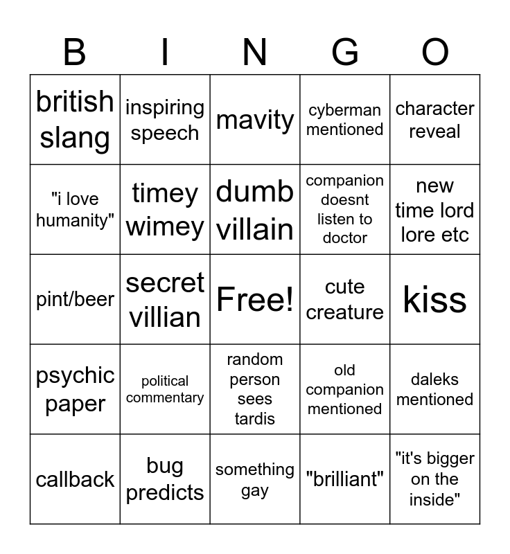 This bingo card has a free space and 51 words: "dr who?", "it's bigger on the inside", doctor cries, something gay, political commentary, political metaphor, inspiring speech, tardis breaks, "i love humanity", master mentioned, timey wimey, cyberman mentioned, daleks mentioned, old companion mentioned, old doctor reference, dad joke/pun, dumb villain, cute creature, historical figure, character reveal, secret villian, "brilliant", british slang, companion doesnt listen to doctor, stranger in the tardis, someone thinks its a prank/doesn't believe in time travel/aliens, new time lord lore etc, old lore, callback, mavity, really dumb rule, paradox, breaks a rule, plot armor, dumb decision, bug predicts, victory speech, bell bottoms, miscommunication, royalty shows up, kiss, psychic paper, peeking, slapstick humor, pop culture reference, pop song, pint/beer, time war mention, "DOCTOR!!!", random person sees tardis and sacrifice of life.