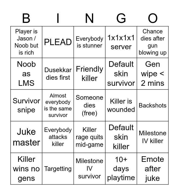 This bingo card has a free space and 37 words: Killer falls for clone, Server wipe < 3 mins, Two time dies first, Dusekkar dies first, Milestone IV killer, Everybody attacks killer, Friendly killer, Stunner whiff, Chance dies after gun blowing up, Support fails miserably, Almost everybody is the same survivor, 1x1x1x1 server, Emote after juke, Backshots, Noob as LMS, Juke master, Killer only kills one person, Everybody is stunner, Killer rage quits mid-game, Killer is wounded, Player is Jason / Noob but is rich, Gen wipe < 2 mins, Killer wins no gens, Milestone IV survivor, Insane lag spike, 10+ days playtime, PLEAD, Creation of hatred, Everybody is survivalist, Killer snipe, Avatar cosplay, Targetting, Survivor snipe, Everybody is support, Default skin killer, Default skin survivor and Yourself John Doe / Noob.