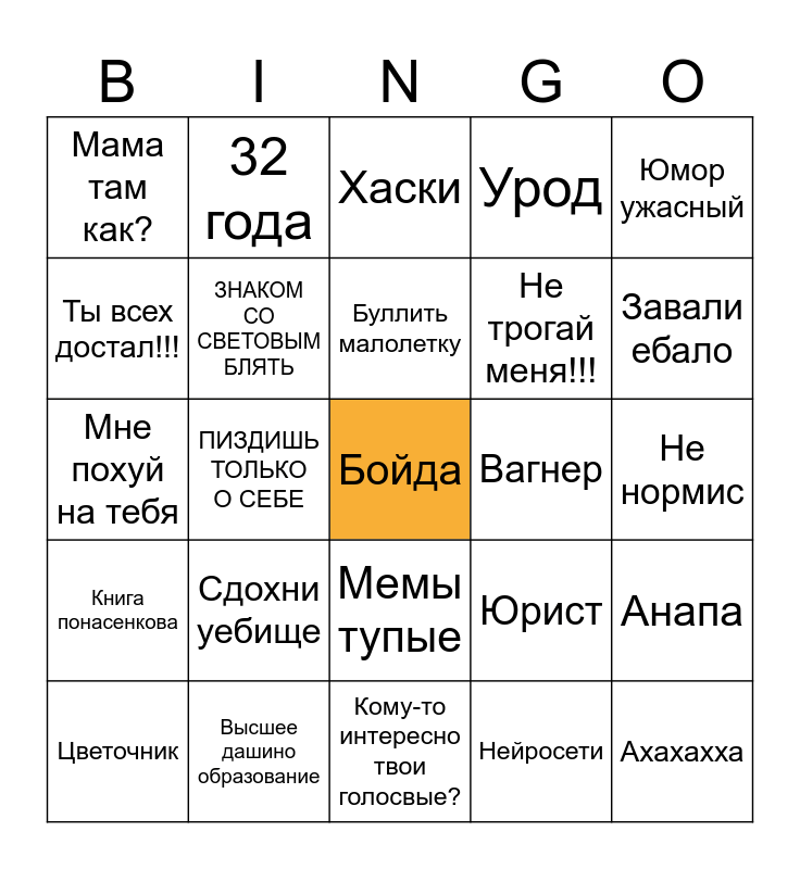 This bingo card has a free space and 24 words: Сдохни уебище, Высшее дашино образование, Буллить малолетку, Цветочник, Юмор ужасный, Мама там как?, Ты всех достал!!!, 32 года, Вагнер, Мемы тупые, Не трогай меня!!!, Мне похуй на тебя, Юрист, Анапа, ЗНАКОМ СО СВЕТОВЫМ БЛЯТЬ, Нейросети, Не нормис, Хаски, Завали ебало, ПИЗДИШЬ ТОЛЬКО О СЕБЕ, Ахахахха, Книга понасенкова, Урод and Кому-то интересно твои голосвые?.