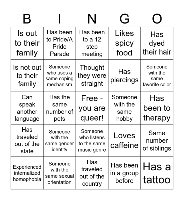 This bingo card has a free space and 24 words: Someone with the same gender identity, Someone with the same sexual orientation, Thought they were straight, Experienced internalized homophobia, Has dyed their hair, Is out to their family, Is not out to their family, Has been to Pride/A Pride Parade, Someone with the same hobby, Someone who listens to the same music genre, Has piercings, Can speak another language, Loves caffeine, Same number of siblings, Someone who uses a same coping mechanism, Has been in a group before, Has been to therapy, Has been to a 12 step meeting, Someone with the same favorite color, Has the same number of pets, Has a tattoo, Has traveled out of the state, Likes spicy food and Has traveled out of the country.