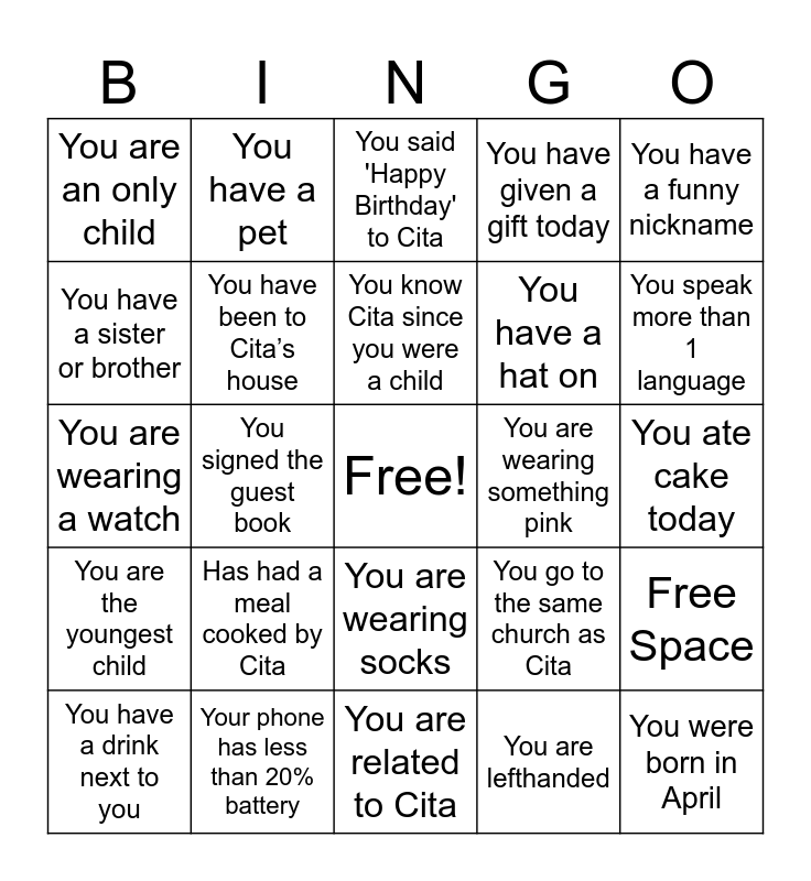 This bingo card has a free space and 25 words: Has had a meal cooked by Cita, You are related to Cita, You know Cita since you were a child, You have a drink next to you, You have a funny nickname, You are an only child, You have a sister or brother, You have a pet, You are wearing something pink, You are wearing socks, You have a hat on, You are wearing a watch, You go to the same church as Cita, Free Space, You have been to Cita’s house, You have taken a photo with Cita today, You ate cake today, You said 'Happy Birthday' to Cita, You speak more than 1 language, You signed the guest book, You were born in April, Your phone has less than 20% battery, You are the youngest child, You have given a gift today and You are lefthanded.