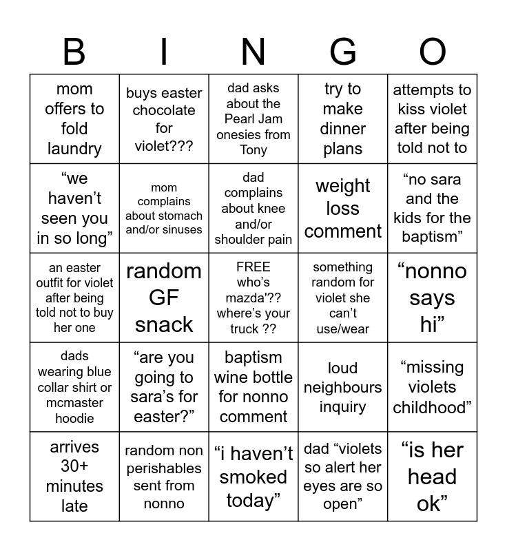 This bingo card has a free space and 24 words: “are you going to sara’s for easter?”, random non perishables sent from nonno, dad complains about knee and/or shoulder pain, arrives 30+ minutes late, attempts to kiss violet after being told not to, mom offers to fold laundry, “we haven’t seen you in so long”, buys easter chocolate for violet???, something random for violet she can’t use/wear, baptism wine bottle for nonno comment, weight loss comment, an easter outfit for violet after being told not to buy her one, loud neighbours inquiry, “missing violets childhood”, mom complains about stomach and/or sinuses, dad “violets so alert her eyes are so open”, “nonno says hi”, dad asks about the Pearl Jam onesies from Tony, “no sara and the kids for the baptism”, random GF snack, “is her head ok”, dads wearing blue collar shirt or mcmaster hoodie, try to make dinner plans and “i haven’t smoked today”.