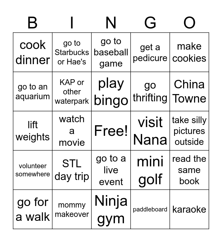 This bingo card has a free space and 29 words: go for a walk, go for a bike ride, watch a movie, play a game, cook dinner, go to baseball game, KAP or other waterpark, STL day trip, visit Nana, mommy makeover, take silly pictures outside, karaoke, Ninja gym, paddleboard, China Towne, try a new restaurant, go to a live event, volunteer somewhere, make cookies, lift weights, mini golf, tiktok challenge, go thrifting, go to an aquarium, get a pedicure, go to Starbucks or Hae's, read the same book, play bingo and bungee fitness.