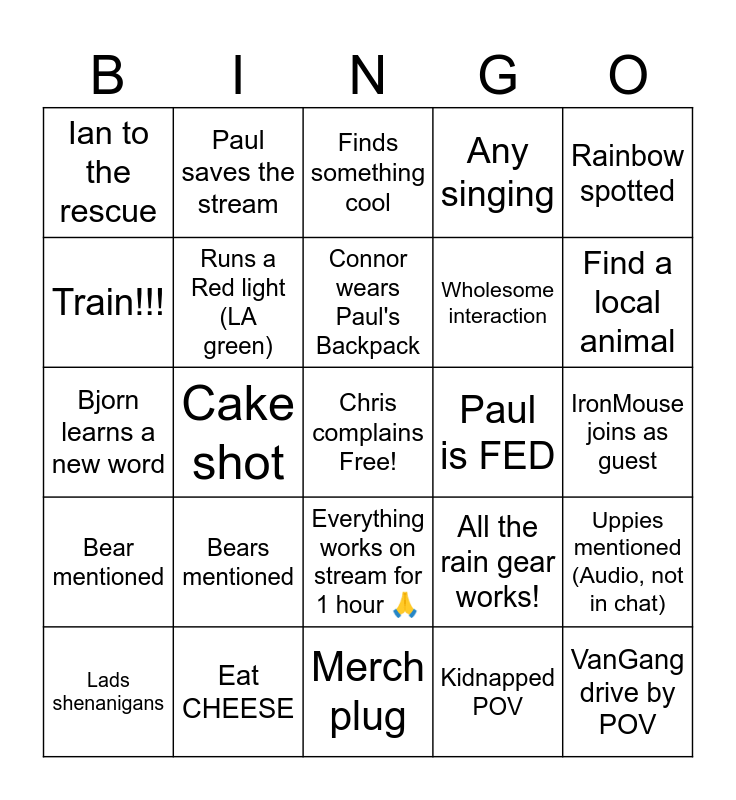 This bingo card has a free space and 29 words: Lads shenanigans, Water resistant gear fail, Cake shot, CINEMA, Ian to the rescue, Finds something cool, Runs a Red light (LA green), Bears mentioned, Paul is FED, Eat CHEESE, IronMouse joins as guest, VanGang drive by POV, Merch plug, Kidnapped POV, Find a local animal, E-bike is mentioned, Everything works on stream for 1 hour 🙏, Bear mentioned, Rainbow spotted, Bjorn learns a new word, All the rain gear works!, Chris does AD read, Wholesome interaction, Train!!!, Any singing, Paul saves the stream, Uppies mentioned (Audio, not in chat), Connor wears Paul's Backpack and Osmo Looks down POV 5 min+.