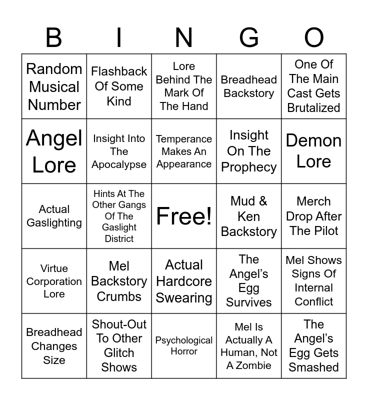 This bingo card has a free space and 24 words: Mel Backstory Crumbs, Shout-Out To Other Glitch Shows, Temperance Makes An Appearance, Breadhead Changes Size, One Of The Main Cast Gets Brutalized, Random Musical Number, Angel Lore, Flashback Of Some Kind, Mud & Ken Backstory, Actual Hardcore Swearing, Insight On The Prophecy, Actual Gaslighting, The Angel’s Egg Survives, Mel Shows Signs Of Internal Conflict, Insight Into The Apocalypse, Mel Is Actually A Human, Not A Zombie, Merch Drop After The Pilot, Lore Behind The Mark Of The Hand, Demon Lore, Hints At The Other Gangs Of The Gaslight District, The Angel’s Egg Gets Smashed, Virtue Corporation Lore, Breadhead Backstory and Psychological Horror.