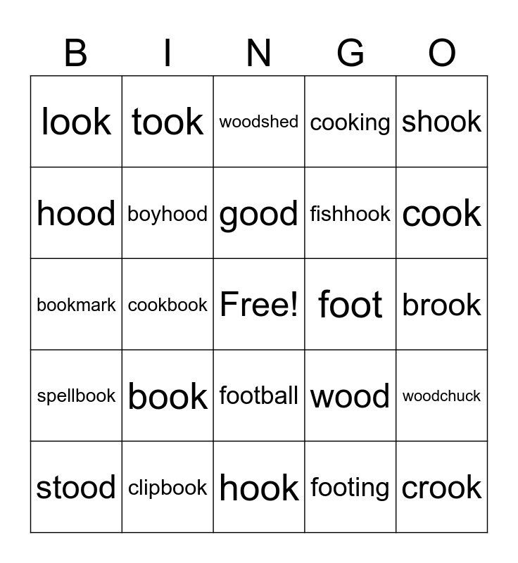 This bingo card has a free space and 25 words: book, hook, good, stood, shook, look, hood, took, foot, football, fishhook, bookmark, wood, woodchuck, boyhood, looking, brook, woodshed, cook, cookbook, crook, clipbook, spellbook, cooking and footing.
