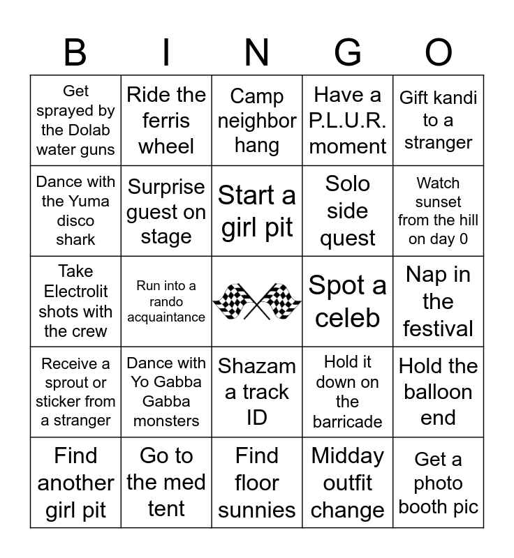 This bingo card has a free space and 24 words: Dance with Yo Gabba Gabba monsters, Go to the med tent, Start a girl pit, Find another girl pit, Gift kandi to a stranger, Get sprayed by the Dolab water guns, Dance with the Yuma disco shark, Ride the ferris wheel, Spot a celeb, Shazam a track ID, Solo side quest, Take Electrolit shots with the crew, Hold it down on the barricade, Hold the balloon end, Surprise guest on stage, Midday outfit change, Nap in the festival, Camp neighbor hang, Watch sunset from the hill on day 0, Run into a rando acquaintance, Get a photo booth pic, Receive a sprout or sticker from a stranger, Have a P.L.U.R. moment and Find floor sunnies.