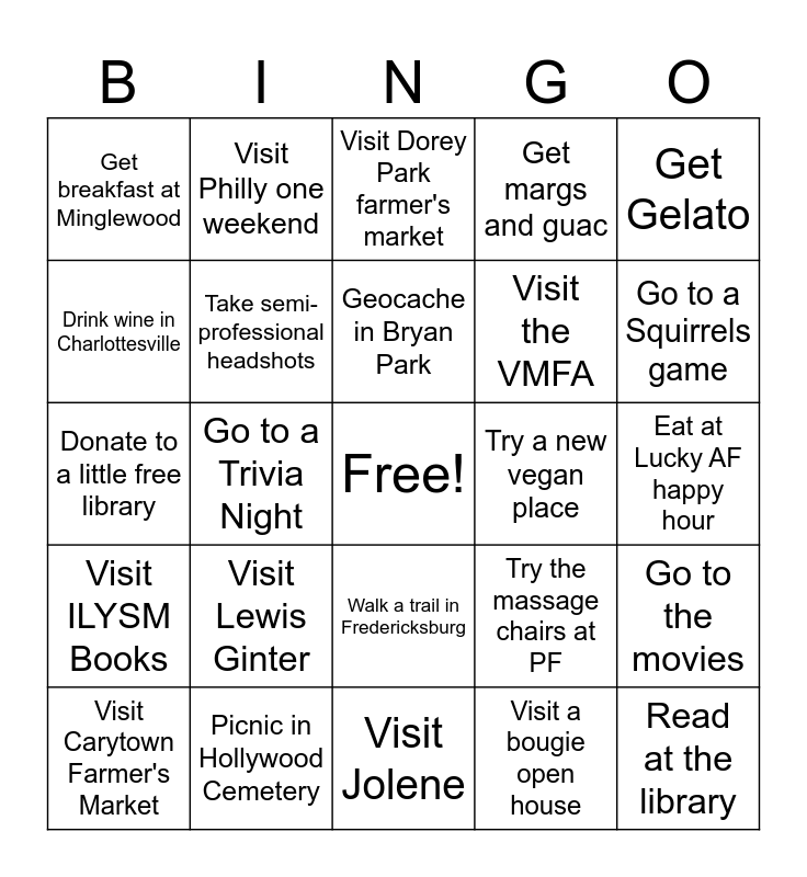 This bingo card has a free space and 24 words: Visit Lewis Ginter, Picnic in Hollywood Cemetery, Geocache in Bryan Park, Visit Carytown Farmer's Market, Get Gelato, Get breakfast at Minglewood, Drink wine in Charlottesville, Visit Philly one weekend, Try a new vegan place, Walk a trail in Fredericksburg, Visit the VMFA, Donate to a little free library, Try the massage chairs at PF, Go to the movies, Take semi-professional headshots, Visit a bougie open house, Eat at Lucky AF happy hour, Visit Dorey Park farmer's market, Go to a Squirrels game, Go to a Trivia Night, Read at the library, Visit ILYSM Books, Get margs and guac and Visit Jolene.