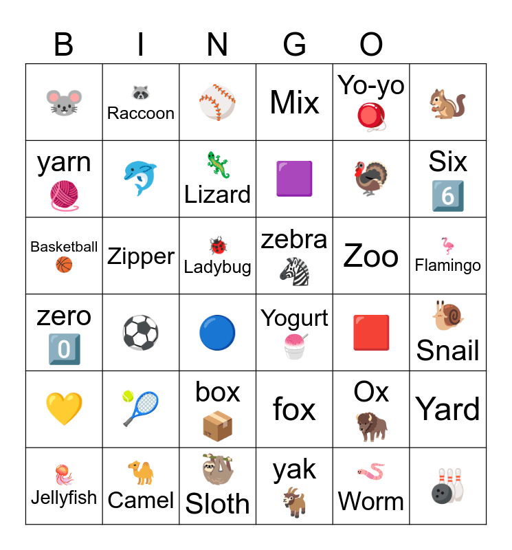 This bingo card has 36 words: fox, box π¦, yak π, yarnπ§Ά, zero 0οΈβ£, zebra π¦, π¬, π¦₯ Sloth, Yo-yo πͺ, Ox π¦¬, Six 6οΈβ£, Mix, Yard, Zipper, πͺ, π, π, Zoo, Basketballπ, βΎοΈ, π Ladybug, β½οΈ, Yogurt π§, π΅, π₯, π¦ Raccoon, π¦, πͺ Camel, π¦ Lizard, πΏ, π³, πͺΌ Jellyfish, π Snail, 𦩠Flamingo, πΎ and πͺ± Worm.
