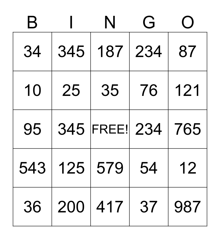 This bingo card has a free space and 24 words: 125, 200, 35, 36, 87, 34, 10, 345, 234, 579, 76, 95, 54, 12, 25, 37, 765, 187, 121, 345, 987, 543, 234 and 417.