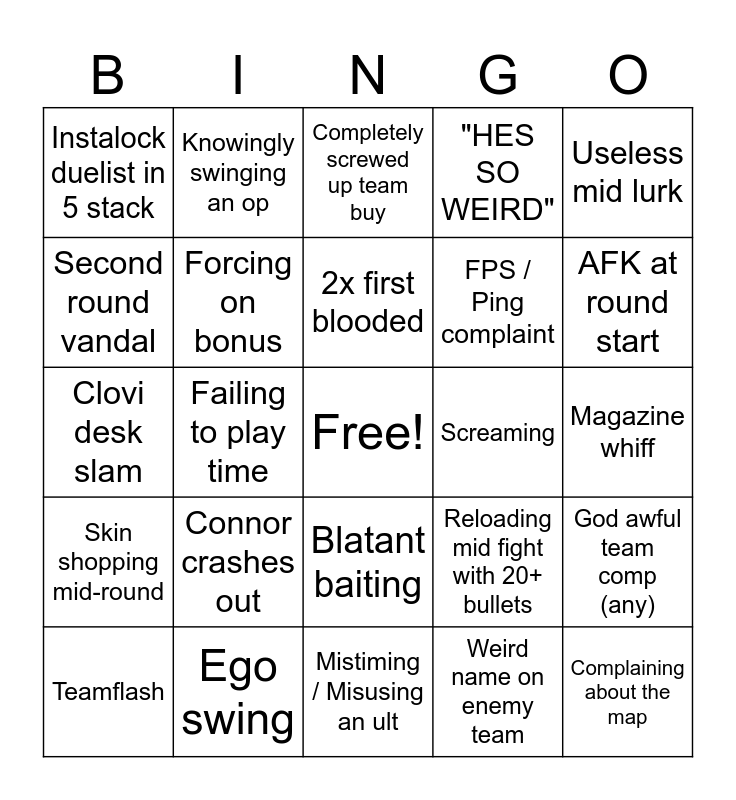 This bingo card has a free space and 24 words: Connor crashes out, Ego swing, 2x first blooded, Teamflash, Useless mid lurk, Instalock duelist in 5 stack, Second round vandal, Knowingly swinging an op, Screaming, Blatant baiting, FPS / Ping complaint, Clovi desk slam, Reloading mid fight with 20+ bullets, God awful team comp (any), Forcing on bonus, Weird name on enemy team, Magazine whiff, Completely screwed up team buy, AFK at round start, Failing to play time, Complaining about the map, Skin shopping mid-round, "HES SO WEIRD" and Mistiming / Misusing an ult.