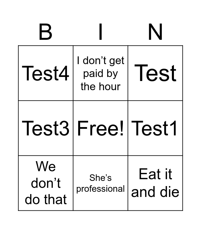This bingo card has a free space and 11 words: Ladies, ladies; calm down, She’s professional, Eat it and die, We don’t do that, I don’t get paid by the hour, Test, Test1, Test 2, Test3, Test4 and Test5.