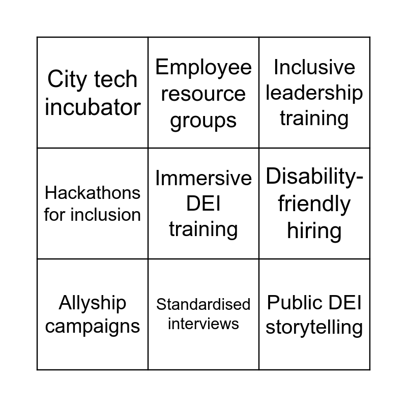 ⚠ This card has duplicate items: Inclusive hiring practices (2), Digital upskilling programs (2), Promoting female role models in tech (2), Neurodiversity initiatives (2), Pay equity audits (2), Employee resource groups (2), Blind candidate reviews (2), Standardised interviews (2), AI bias mitigation tools (2), Diversity analytics software (2), Allyship campaigns (2), Tech for inclusive urban design (2), Immersive DEI training (2), Intersectional DEI strategies (2), Disability-friendly hiring (2), Youth coding programs (2), City tech incubator (2), Digital education for school children (2), Public DEI storytelling (2), Inclusive leadership training (2), Digital access support for the elderly (2), Hackathons for inclusion (2), Female-friendly tech/AI career support (2), Inclusive local tech job fairs (2), Cross-sector DEI reporting (2), Job ad equity practices (2), Language-inclusive tech use (2), Data equity in AI systems (2)