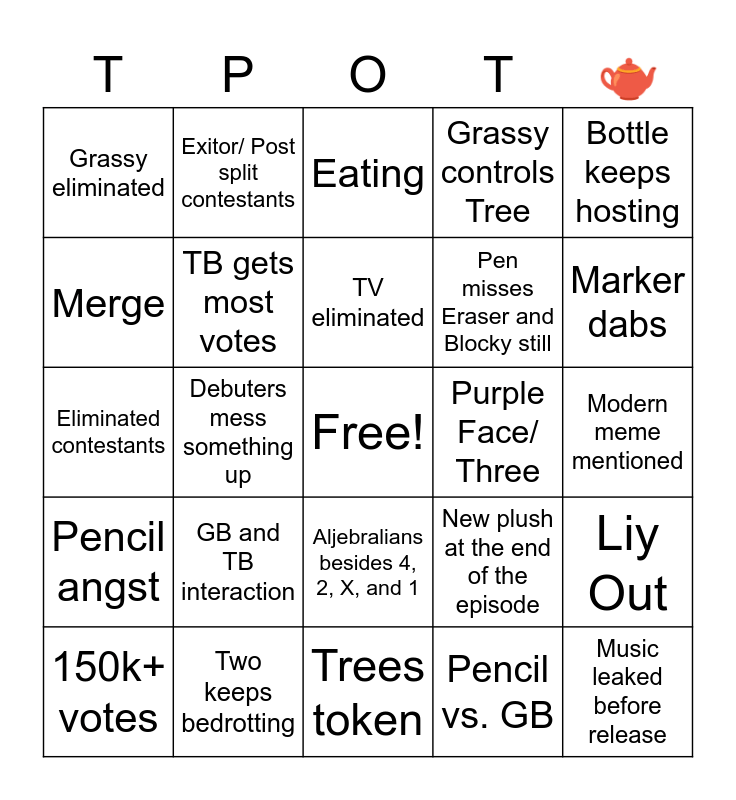 This bingo card has a free space and 24 words: GB and TB interaction, Two keeps bedrotting, TV eliminated, 150k+ votes, Bottle keeps hosting, Grassy eliminated, Merge, Exitor/ Post split contestants, Purple Face/ Three, Aljebralians besides 4, 2, X, and 1, Pen misses Eraser and Blocky still, Eliminated contestants, New plush at the end of the episode, Liy Out, TB gets most votes, Pencil vs. GB, Modern meme mentioned, Eating, Marker dabs, Debuters mess something up, Music leaked before release, Pencil angst, Grassy controls Tree and Trees token.