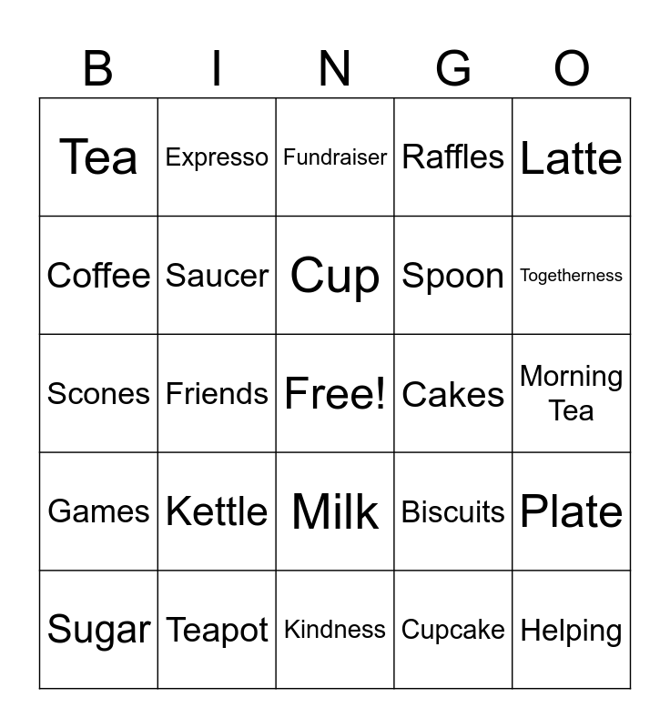 This bingo card has a free space and 24 words: Kettle, Teapot, Cup, Sugar, Latte, Tea, Coffee, Expresso, Cakes, Milk, Spoon, Scones, Biscuits, Plate, Saucer, Cupcake, Morning Tea, Fundraiser, Togetherness, Friends, Helping, Games, Raffles and Kindness.