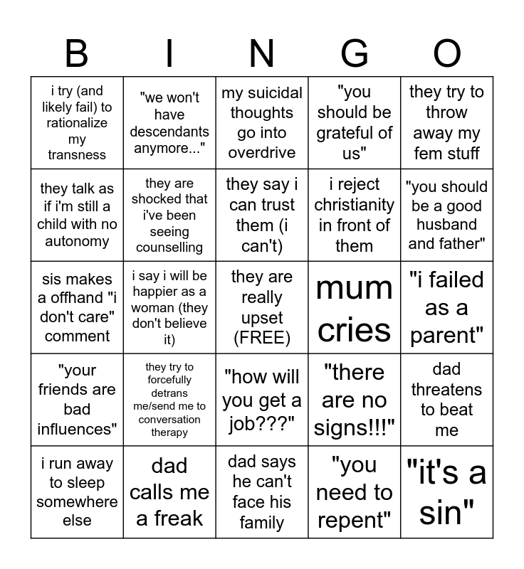 This bingo card has a free space and 24 words: they try to forcefully detrans me/send me to conversation therapy, dad calls me a freak, they say i can trust them (i can't), i run away to sleep somewhere else, they try to throw away my fem stuff, i try (and likely fail) to rationalize my transness, they talk as if i'm still a child with no autonomy, "we won't have descendants anymore...", mum cries, "how will you get a job???", i reject christianity in front of them, sis makes a offhand "i don't care" comment, "there are no signs!!!", dad threatens to beat me, they are shocked that i've been seeing counselling, "you need to repent", "i failed as a parent", my suicidal thoughts go into overdrive, "you should be a good husband and father", i say i will be happier as a woman (they don't believe it), "it's a sin", "your friends are bad influences", "you should be grateful of us" and dad says he can't face his family.