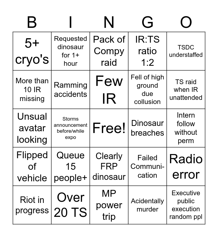 This bingo card has a free space and 24 words: Queue 15 people+, Over 20 TS, Few IR, Riot in progress, TSDC understaffed, 5+ cryo's, More than 10 IR missing, Requested dinosaur for 1+ hour, Dinosaur breaches, Clearly FRP dinosaur, Fell of high ground due collusion, Unsual avatar looking, Failed Communi-cation, Radio error, Ramming accidents, Acidentally murder, Intern follow without perm, Pack of Compy raid, TS raid when IR unattended, Storms announcement before/while expo, Executive public execution random ppl, Flipped of vehicle, IR:TS ratio 1:2 and MP power trip.