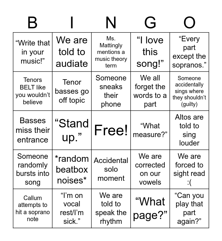This bingo card has a free space and 29 words: Callum attempts to hit a soprano note, “Hey everyone”, “Stand up.”, Sopranos are told to sing quieter, “Write that in your music!”, Ms. Mattingly mentions a music theory term, Tenor basses go off topic, *random beatbox noises*, “What measure?”, “I’m on vocal rest/I’m sick.”, Altos are told to sing louder, “Can you play that part again?”, We are told to speak the rhythm, “What page?”, Someone accidentally sings where they shouldn’t (guilty), “What song?”, Accidental solo moment, Someone randomly bursts into song, “Every part except the sopranos.”, Basses miss their entrance, We are corrected on our vowels, Someone misses a cut-off, We all forget the words to a part, Tenors BELT like you wouldn’t believe, “I love this song!”, We are told to audiate, We are forced to sight read :(, Someone sneaks their phone and “I hate this song.”.