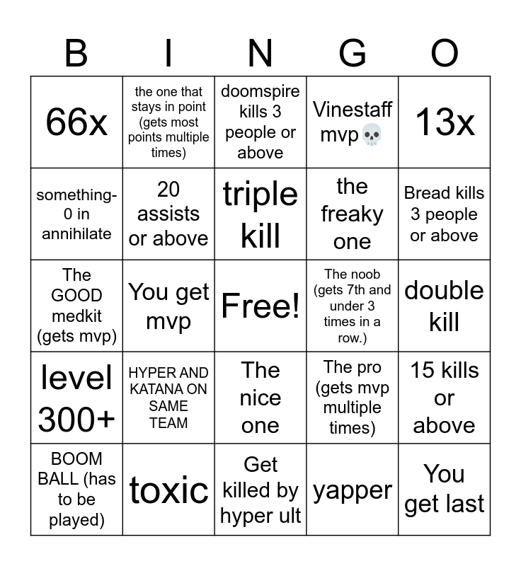This bingo card has a free space and 24 words: HYPER AND KATANA ON SAME TEAM, toxic, triple kill, BOOM BALL (has to be played), 13x, 66x, something-0 in annihilate, the one that stays in point (gets most points multiple times), The noob (gets 7th and under 3 times in a row.), The nice one, the freaky one, The GOOD medkit (gets mvp), The pro (gets mvp multiple times), 15 kills or above, 20 assists or above, yapper, double kill, doomspire kills 3 people or above, Bread kills 3 people or above, You get mvp, You get last, level 300+, Vinestaff mvp💀 and Get killed by hyper ult.