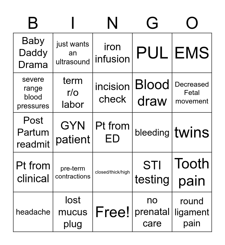 This bingo card has 25 words: Pt from clinical, lost mucus plug, Pt from ED, no prenatal care, EMS, Baby Daddy Drama, just wants an ultrasound, iron infusion, bleeding, Tooth pain, severe range blood pressures, term r/o labor, Free!, STI testing, Decreased Fetal movement, headache, GYN patient, incision check, Blood draw, twins, Post Partum readmit, pre-term contractions, closed/thick/high, PUL and round ligament pain.