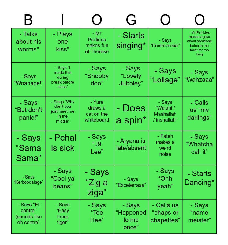 This bingo card has 36 words: - Says “Exceterraaa”, - Says “Zig a ziga”, - Says “Happened to me once”, - Says “Woahage!”, - Says “Sama Sama”, - Does a spin*, - Says “I made this during break/before class”, - Says “Tee Hee”, - Says “Controversial”, - Says “Ohh yeah”, - Says “Wahzaaa”, - Starts singing*, - Starts Dancing*, - Sings “Why don’t you just meet me in the middle”, - Says “Lovely Jubbley”, - Talks about his worms*, - Says “Kerboodalage”, - Says “Walahi / Mashallah / inshallah”, - Says “But don’t panic!”, - Mr Psillides makes fun of Therese, - Yura draws a cat on the whiteboard, - Pehal is sick, - Aryana is late/absent, - Says “J9 Lee”, - Fateh makes a weird noise, - Plays one kiss*, - Says “Lollage”, - Says “Easy there tiger”, - Says “Shooby doo”, - Mr Psillides makes a joke about someone being in the toilet for too long, - Says “name meister”, - Says “Et contre” (sounds like oh contre), - Says “Whatcha call it”, - Calls us “my darlings”, - Says “Cool ya beans” and - Calls us “chaps or chapettes”.