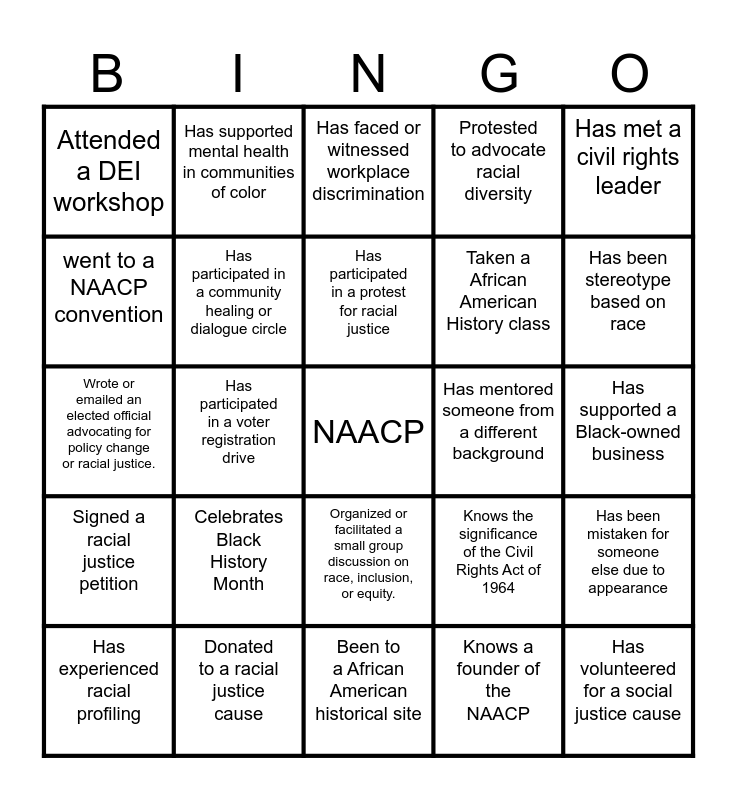 This bingo card has a free space and 24 words: Has experienced racial profiling, Celebrates Black History Month, Has participated in a protest for racial justice, Knows a founder of the NAACP, Has met a civil rights leader, Attended a DEI workshop, Has supported mental health in communities of color, Has faced or witnessed workplace discrimination, Has mentored someone from a different background, Has supported a Black-owned business, Wrote or emailed an elected official advocating for policy change or racial justice., Has participated in a community healing or dialogue circle, Knows the significance of the Civil Rights Act of 1964, Has been mistaken for someone else due to appearance, went to a NAACP convention, Donated to a racial justice cause, Been to a African American historical site, Protested to advocate racial diversity, Has been stereotype based on race, Signed a racial justice petition, Has participated in a voter registration drive, Organized or facilitated a small group discussion on race, inclusion, or equity., Taken a African American History class and Has volunteered for a social justice cause.