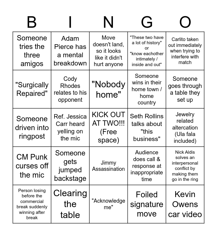 This bingo card has a free space and 46 words: "This is awesome" chant, Kevin Owens car video, Friendship on the brink of divorce, "Acknowledge me", Someone gets jumped backstage, Jey Uso agrees with his opponents diss, Adam Pierce has a mental breakdown, "Career Ending Move" or "Tried to End My Career", "Surgically Repaired", Promo interrupted by someone's theme music, Cody Rhodes relates to his opponent, "These two have a lot of history" or "know eachother intimately / inside and out", Nick Aldis solves an interpersonal conflict by making them go in the ring, Audience does call & response at inappropriate time, TITANIAM SCREW!, "You Suck" chant, "Nobody home", Seth Rollins talks about "this business", Byron Saxton is disrespected, Carlito taken out immediately when trying to interfere with match, Ref. Jessica Carr heard yelling on the mic, Foiled signature move, Someone tries the three amigos, Someone wins in their home town / home country, Someone lipsynchs their entrance, Someone goes through a table they set up, Person losing before the commercial break suddenly winning after break, Michael Cole insults someone (Chelsea, Dom, Liv), Jimmy Assassination, CM Punk curses off the mic, Someone's ponytail falls out, Little dance in middle of fight, "Are they gonna kiss" moment occurs, Titty Slap, Caught during suicide dive, Clearing the table, Jewelry related altercation (Ula fala included), Soul Mentioned, Siphoning power from the crowd, Kip-up, "Dumped outside the ring", Move doesn't land, so it looks like it didn't hurt anyone, Someone driven into ringpost, Crawling to tag team partner, Knees up! and Cheap Shot.