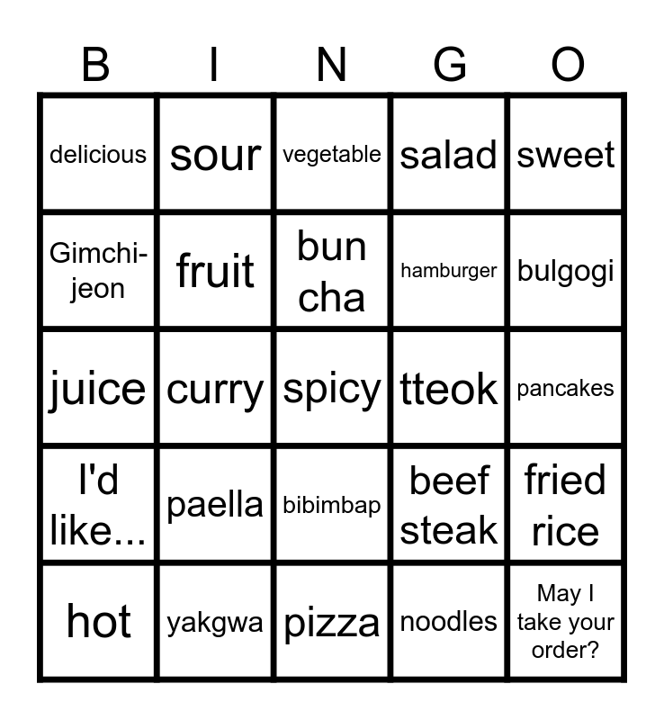 This bingo card has a free space and 24 words: paella, yakgwa, bun cha, hot, sweet, delicious, Gimchi-jeon, sour, tteok, bibimbap, hamburger, juice, beef steak, fried rice, fruit, noodles, pancakes, vegetable, bulgogi, curry, May I take your order?, I'd like..., salad and pizza.