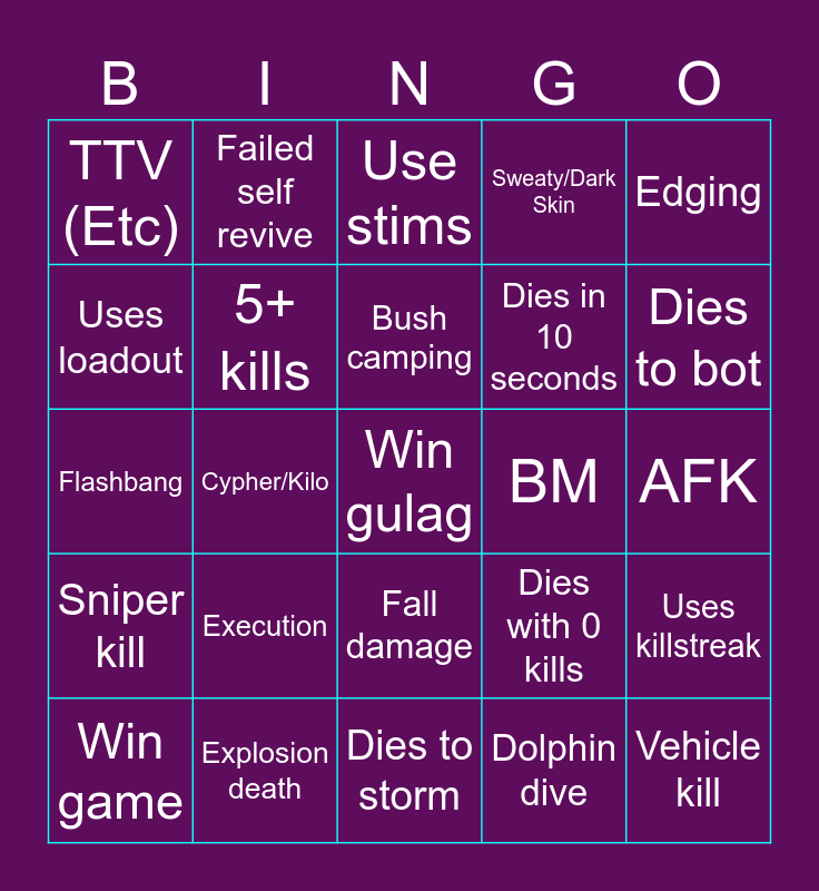 This bingo card has a free space and 24 words: Win game, Execution, Bush camping, Dolphin dive, Edging, TTV (Etc), Failed self revive, Use stims, BM, AFK, Flashbang, 5+ kills, Dies with 0 kills, Uses killstreak, Uses loadout, Explosion death, Dies to storm, Sweaty/Dark Skin, Dies to bot, Sniper kill, Cypher/Kilo, Fall damage, Dies in 10 seconds and Vehicle kill.